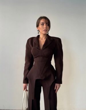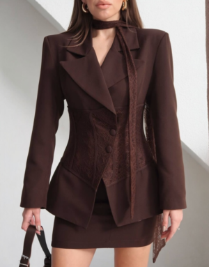 Garnitur EMORÉ „Corséa” – taliowana marynarka z gorsetowym wiązaniem