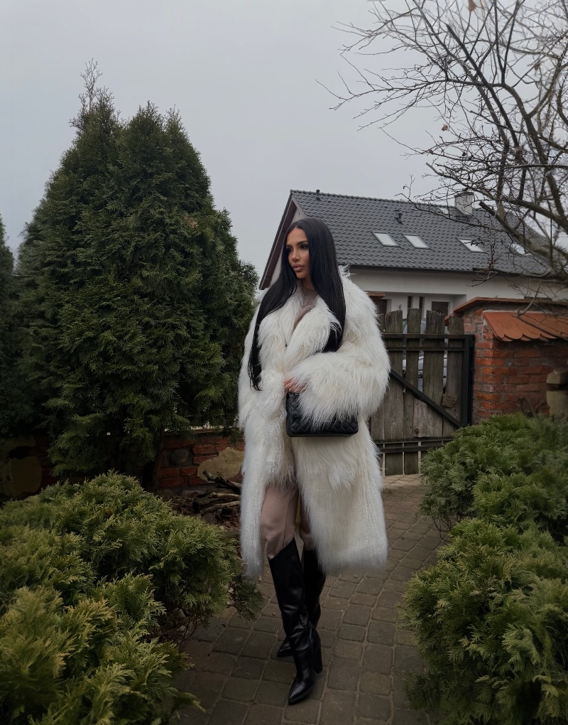 Białe futro wykonane z wysokiej jakości sztucznego materiału, miękkie i efektowne. Idealne do zimowych stylizacji, dodaje luksusowego charakteru i elegancji.