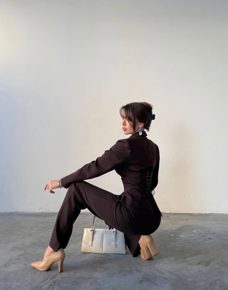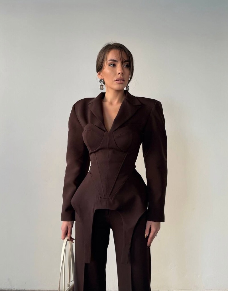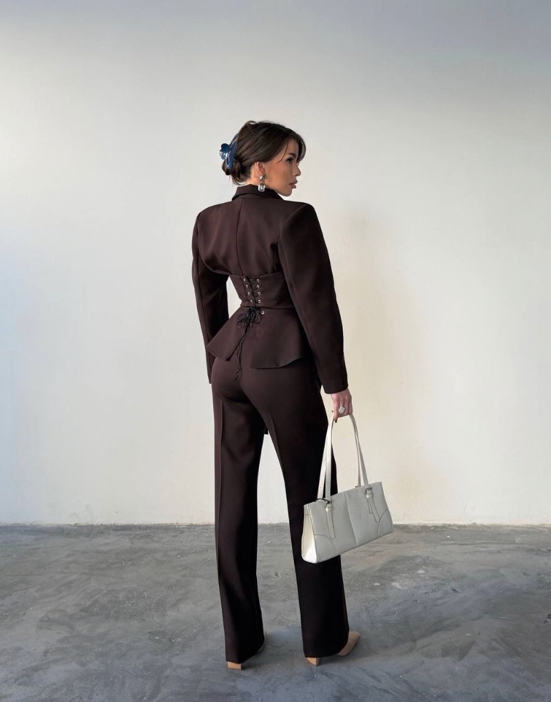 Model Corséa to nowoczesna interpretacja klasycznego garnituru w luksusowym, czekoladowym odcieniu.